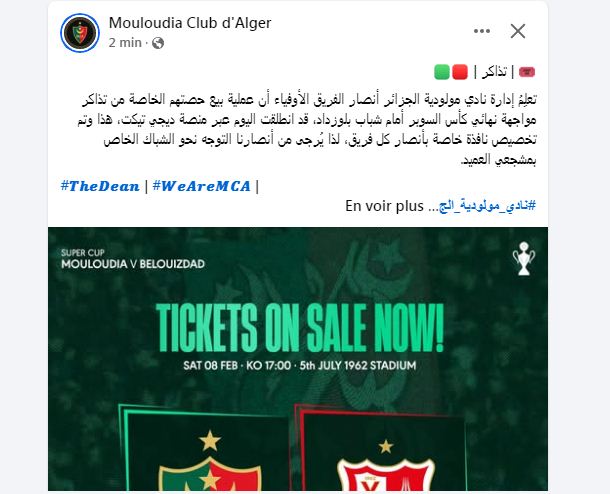 وكشفت إدارة المولودية، في بيان عبر حسابها الرسمي على “فيسبوك” انطلاق عملية بيع حصتهم الخاصة من تذاكر مواجهة نهائي كأس “السوبر”، عبر منصة “ديجي تيكت”.