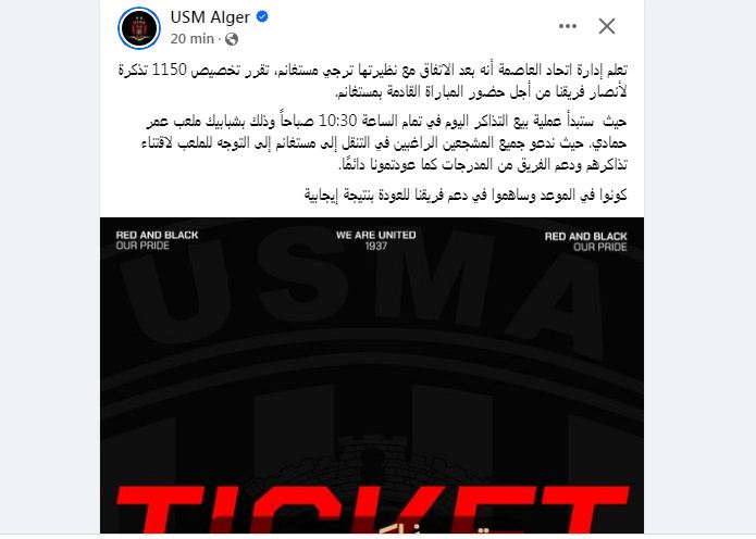 كما دعت إدارة النادي العاصمي، جميع المشجعين الراغبين في التنقل إلى مستغانم، إلى التوجه للملعب. من أجل اقتناء تذاكرهم ودعم الفريق من المدرجات. مثلما جرت عليه العادة، والمساهمة في العودة بنتيجة ايجابية.