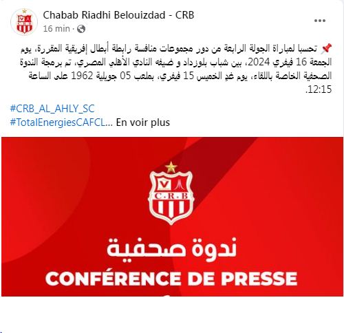 وقالت إدارة الشباب في حسابها الرسمي على “فيسبوك” إن الندوة الصحفية الخاصة بالمواجهة، مبرمجة غدا الخميس، بقاعة المحاضرات التابعة لملعب 5جويلية بداية من الساعة 12:15.
