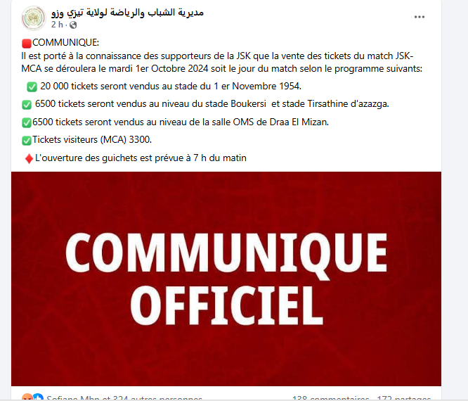 كشفت مديرية الشباب والرياضة لولاية تيزي وزو، اليوم الأحد، أنه سيتم بيع تذاكر مباراة شبيبة القبائل ومولودية الجزائر على مستوى الأكشاك.