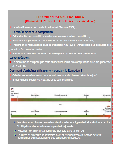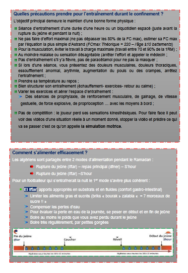 وجاءت هذه التوصيات الخاصة بلاعبي كرة  القدم، خلال شهر رمضان، والذي يتزامن هذه السنة مع فترة الحجر المنزلي، على النحو التالي: