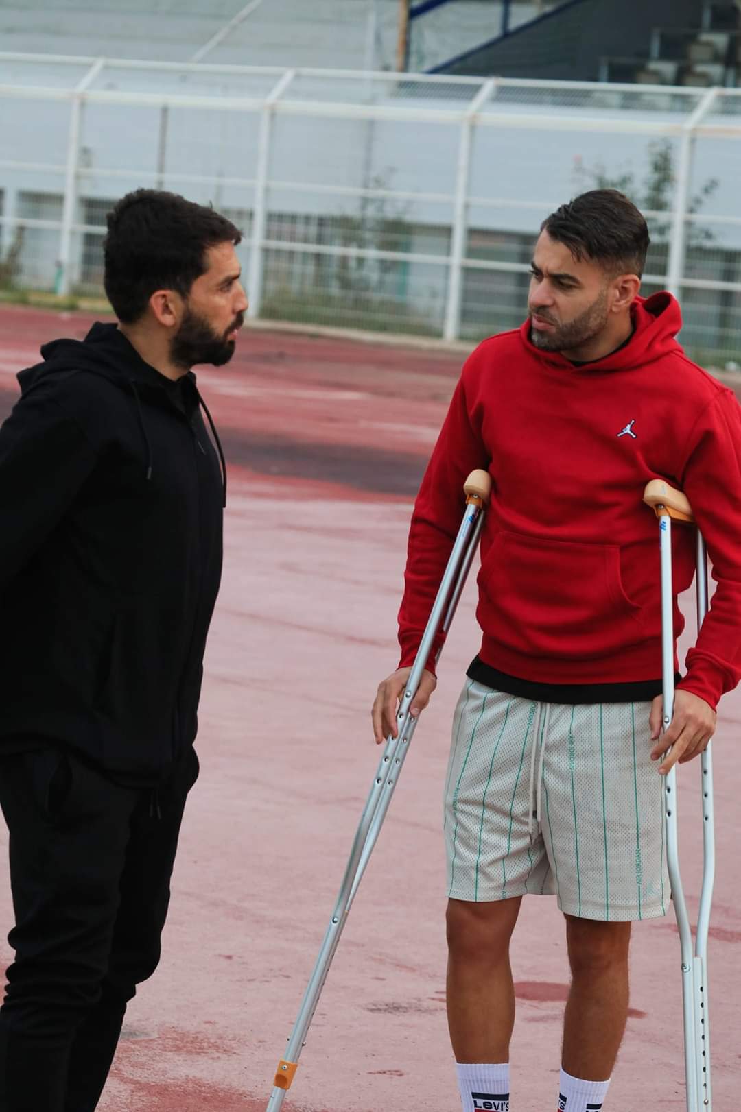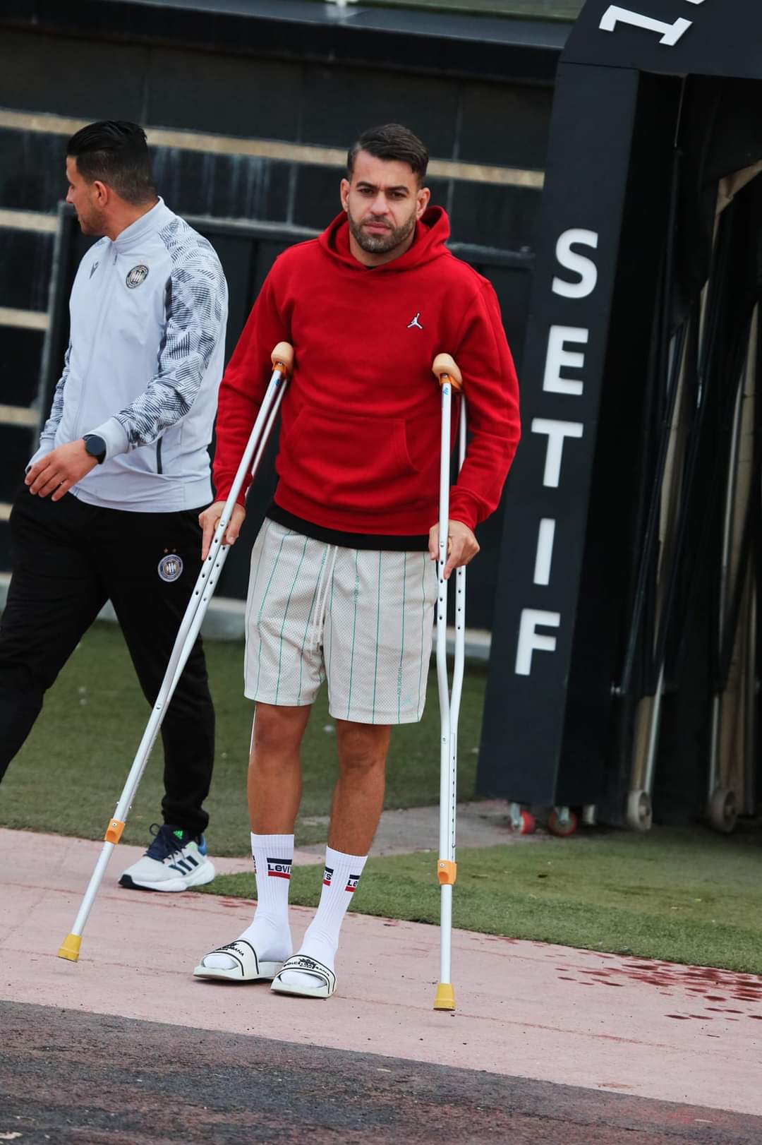 وظهر أكرم جحنيط، بالعكازين، بالنظر لخضوعه مؤخرا لعملية جراحية على مستوى الفخذ بفلندا، للتعافي من الإصابة التي تعرض لها بداية الموسم الجاري في مباراتهم أمام نجم مقرة.