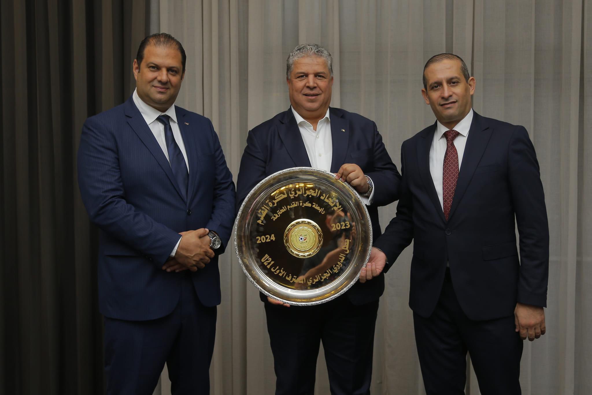 ونشرت الرابطة المحترفة لكرة القدم، عبر صفحتها الرسمية على “فايس بوك”، صور لاستلام الرئيس المدير العام لمجمع مدار، شرف الدين عمارة، درع البطولة من طرف مسير الرابطة المحترفة لكرة القدم أمين مسلوق.
