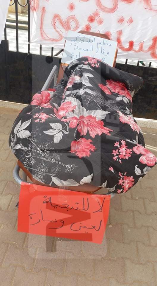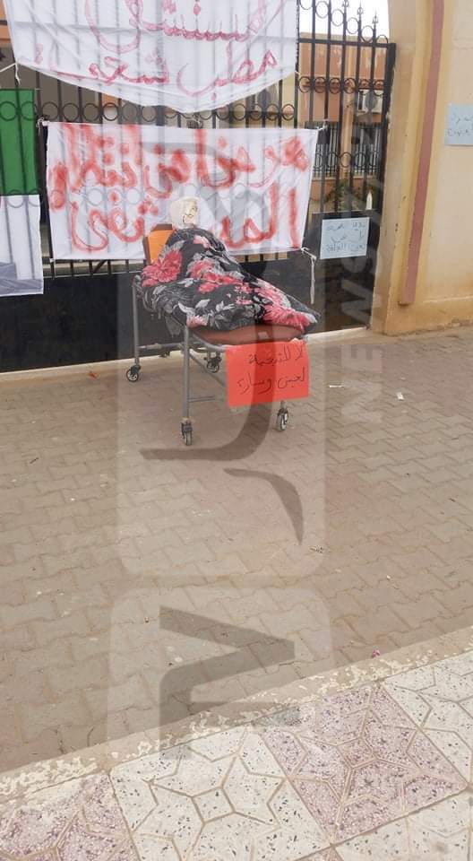 وذلك بعد أن وضعوا العديد من اللفتات التي تدل على الوضع المزري بقطاع الصحة المدينة، وقد وضع المجتجّون مجسّمًا لشخص ميت يدل على وفاة الصحة بالمدينة.