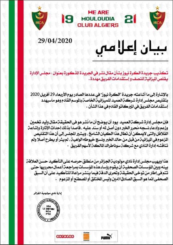 إدارة العميد نشرت بيانا رسميا كذبت فيه المقال الذي جاء في الجريدة وأشار إلى تقليص إدارة المولودية لميزانية الموسم القادم للنصف وهو مايهدد الاستقدامات.