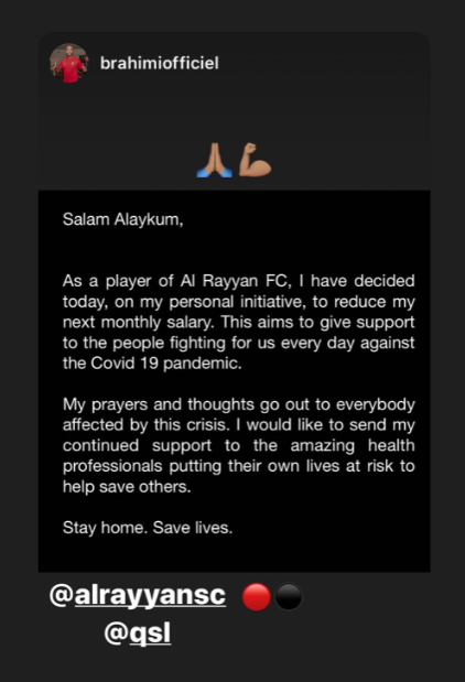 ونشر “براهيمي” عبر الستوري الخاص به في “الانستغرام”: “كلاعب لنادي الريان قررت وبصفة شخصية أن أتنازل عن جزء من راتبي الشهري لمحاربة فيروس كورونا”.