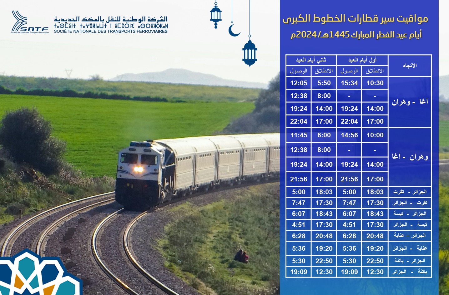 وجاء في بيان الشركة “استعدادا لحلول عيد الفطر المبارك، تعلم الشركة الوطنية للنقل بالسكك الحديدية المسافرين الكرام.، أنه تم وضع برنامج خاص لحركة سير قطارات الخطوط الكبرى خلال أول وثاني أيام العيد”.