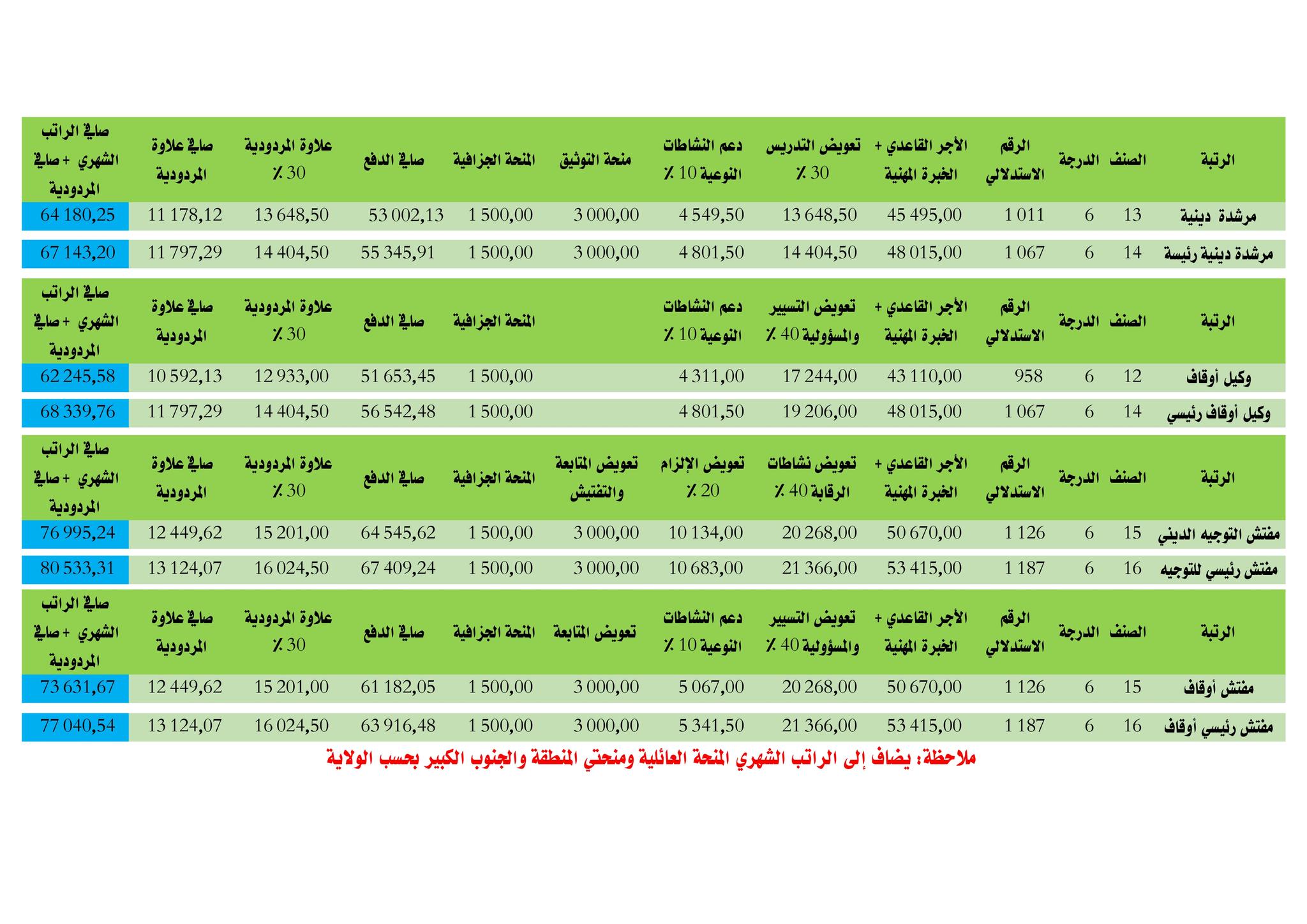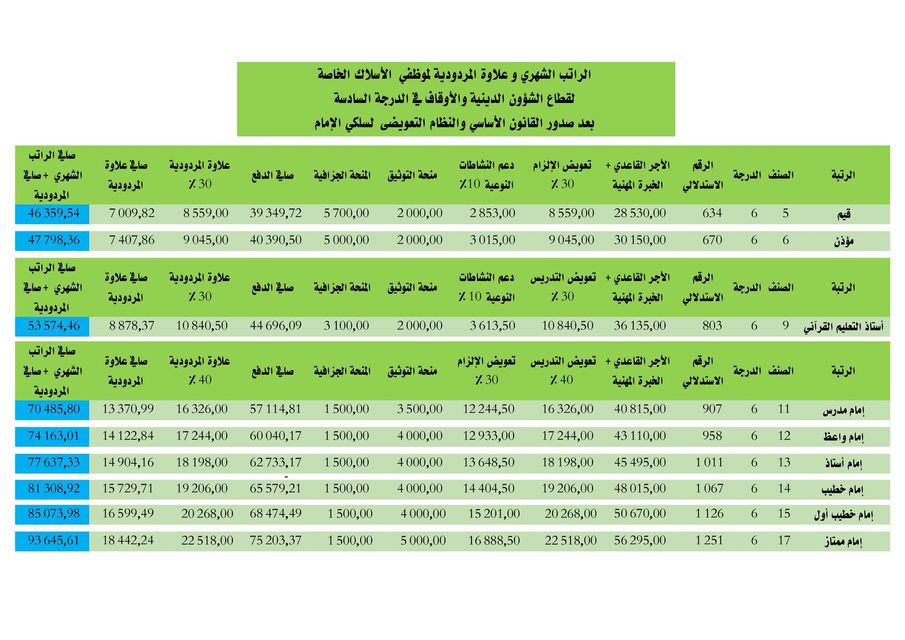 وأشارت الوزارة عبر صفحتها الرسمية على منصة فايسبوك، عبر جدول مفصل تضمن الراتب الشهري. وعلاوة المردودية لموظفي الأسلاك الخاصة لقطاع الشؤون الدينية والأوقاف في الدرجة السادسة. بعد صدور القانون الأساسي والنظام التعويضى لسلكي الإمام، كما هو موضح في الوثيقة المرفقة أدناه.