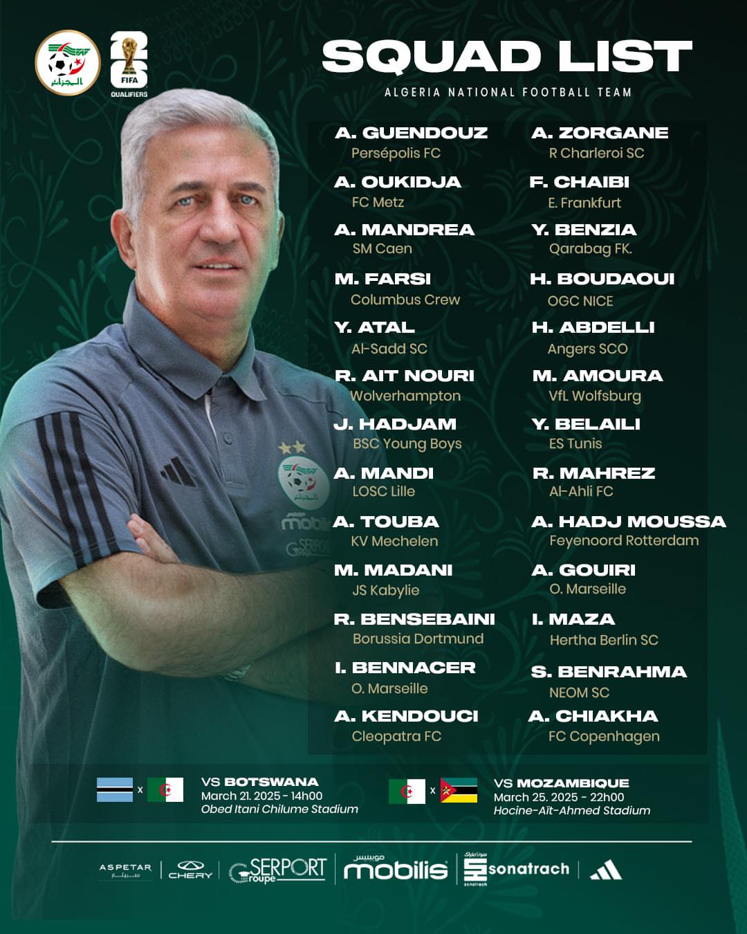 أعلن الناخب الوطني فلاديمير بيتكوفيتش، مساء اليوم الجمعة، عن قائمة اللاعبين المعنية بالتربص القادم، الذي تتخلله مواجتان مهمتان أمام بوتسوانا وموزمبيق ضمن الجولتين الخامسة والسادسة من تصفيات كأس العالم 2026.