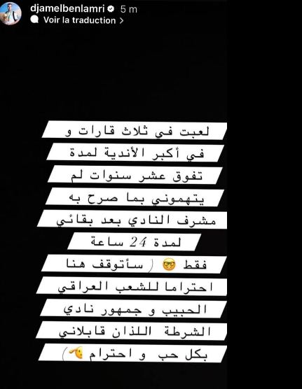 وختم الدولي الجزائري السابق. الذي سارع إلى سحب رده من خاصية “ستوري” قائلا: “أكنّ كل الاحترام للشعب العراقي ونادي الشرطة”.