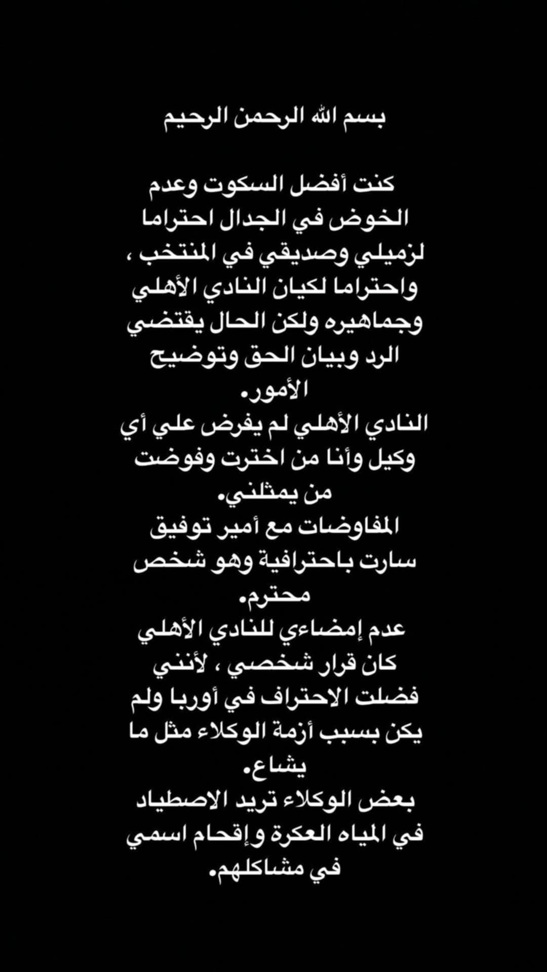 و نشر لاعب نادي سينت ترودينس البلجيكي، اليوم السبت، عبر خاصية “ستوري” على حسابه الرسمي بمنصة “الأنستغرام”. “كنت أفضّل السكوت وعدم الخوض في الجدال احتراما لزميلي وصديقي في المنتخب (يقصد قندوسي)، واحتراما لكيان النادي الأهلي وجماهيره. لكن الحال يقتضي الرد و بيان الحق وتوضيح الأمور”.