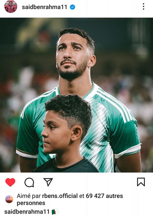 نشر الدولي الجزائري سعيد بن رحمة صورة له بالقميص الوطني رفقة “إيموجي” للعلم الوطني، مع وقوفه شامخا أثناء عزف النشيد الوطني.