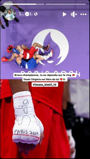 ونشر لاعب الخضر، صورة لإيمان خليف، عبر خاصية “ستوري” في حسابها الشخصي. على “أنستغرام” وأرفقها بعبارة: “برافو يا بطلة، لقد أجبتي في الحلبة، الجزائر كلها فخورة بك”.