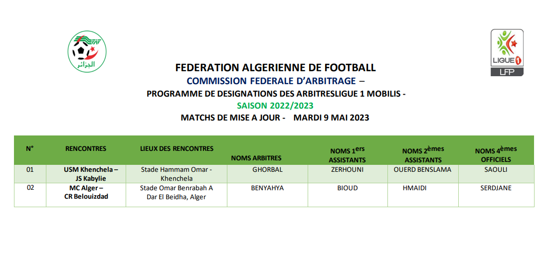 كما عين الحكم غربال، لإدارة المباراة المتأخرة الثانية لحساب ذات الجولة، والتي ستجمع بين شبيبة القبائل، بمضيفه اتحاد خنشلة.