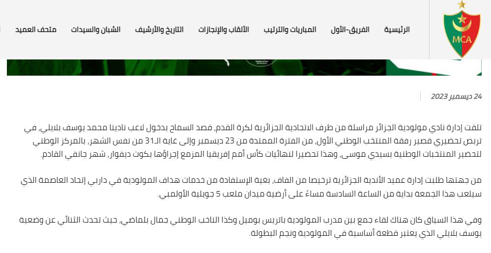 وكشفت إدارة العميد، بأنها تلقت مراسلة من طرف “الفاف”. من أجل السماح بدخول بلايلي، في تربص تحضيري رفقة الخضر. ما بين الـ 23 والـ 31 ديسمبر الجاري. بمركز سيدي موسى.