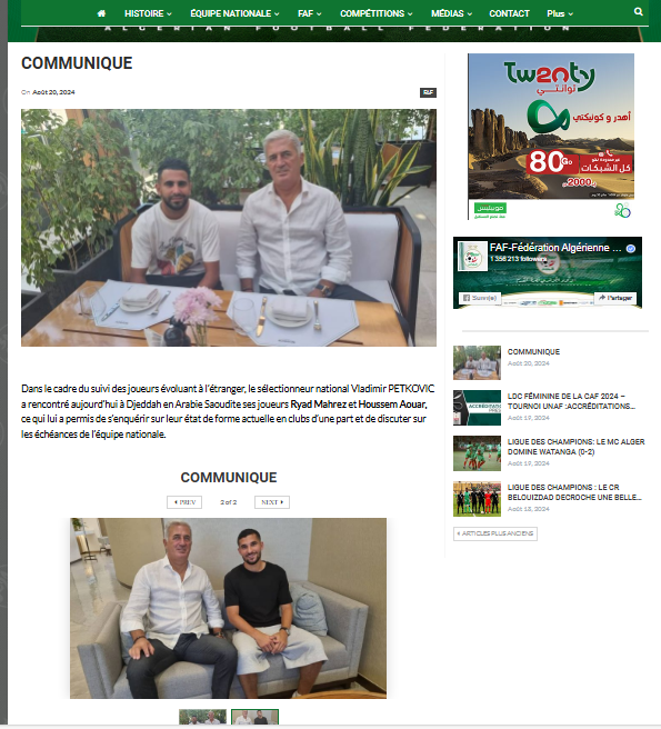 التقى الناخب الوطني فلاديمير بيتكوفيتش، الدوليان الجزائريان رياض محرز و حسام عوار في جدة السعودية، اليوم الثلاثاء، أين تحدث معهما حول الإستحقاقات القادمة لـ “الخضر”.