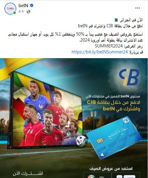 كما دعت “بي إن سبورت” عبر منشور في حسابها على “فيسبوك” جمهورها من الشعب الجزائري، للاستماع بعروضها الصيفية.