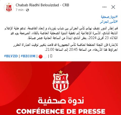 كما أعلنت الإدارة البلوزدادية في السياق ذاته. بأن الندوة الصحفية الخاصة بـ “داربي الكأس” مبرمجة غدا الثلاثاء، بمقر النادي ابتداء من الساعة 11:00.