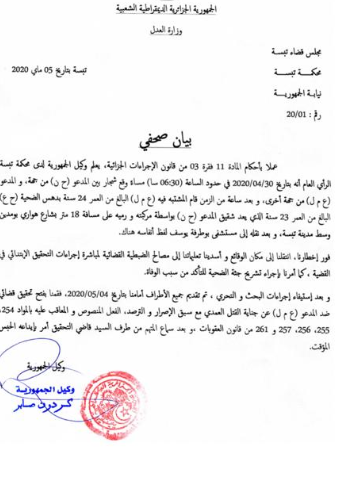 وكشف وكيل الجمهورية بمحكمة تبسة، صابر كردون، الذي أصدر بيانا صحفيا ملابسات القضية، أنه وقع شجار بين المشتبه به (ع م ل) البالغ من العمر 24 سنة وشاب آخر يدعى (ح ن).