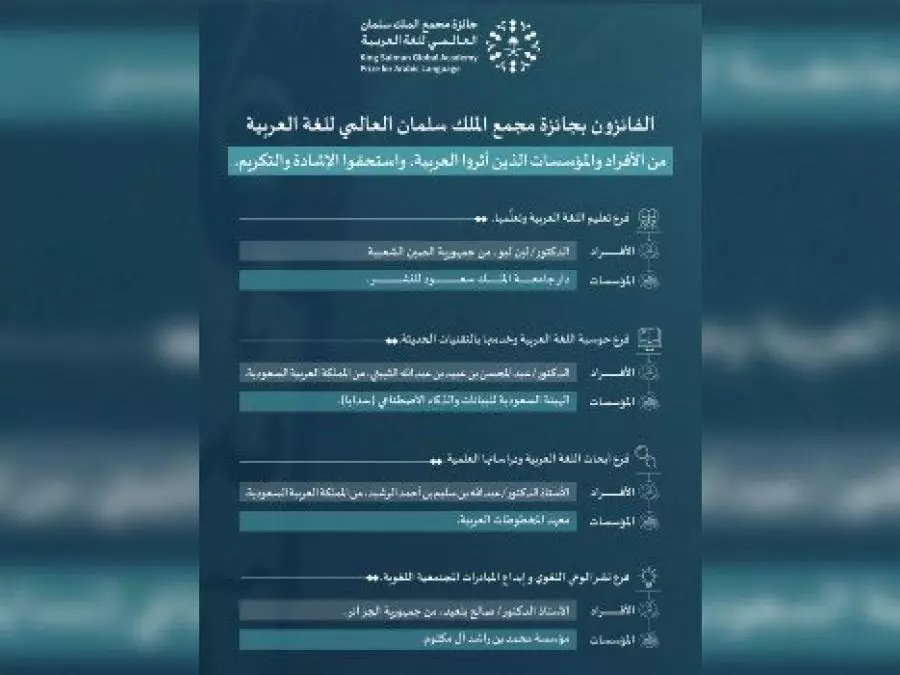 وتكرّم هذه الجائزة التي سيتم تسليمها في 24 نوفمبر المقبل بالعاصمة السعودية الرياض، الأفراد والمؤسسات البارزة في مجالات اللغة العربية الأربعة وهي” تعليم العربية وتعلمها”، “حوسبة اللغة العربية وخدمتها بالتقنيات الحديثة”، “أبحاث اللغة العربية ودراساتها العلمية” و”نشر الوعي اللغوي وإبداع مبادرات مجتمعية لغوية”.