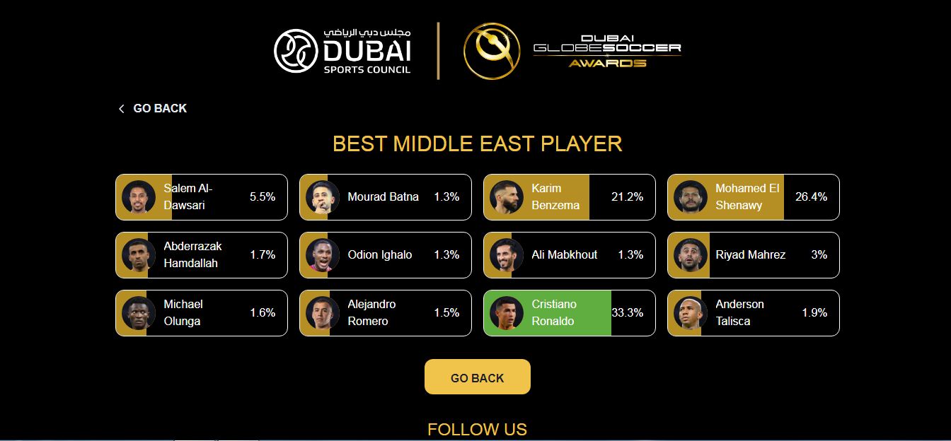 بينما يأتي الحارس المصري الشناوي. في الوصافة بـ 26.4% متبوعا بالفرنسي بن زيمة، بـ 21.2%، فسالم الدوسري لاعب الهلال السعودي بـ 5.5% في المركز الرابع.