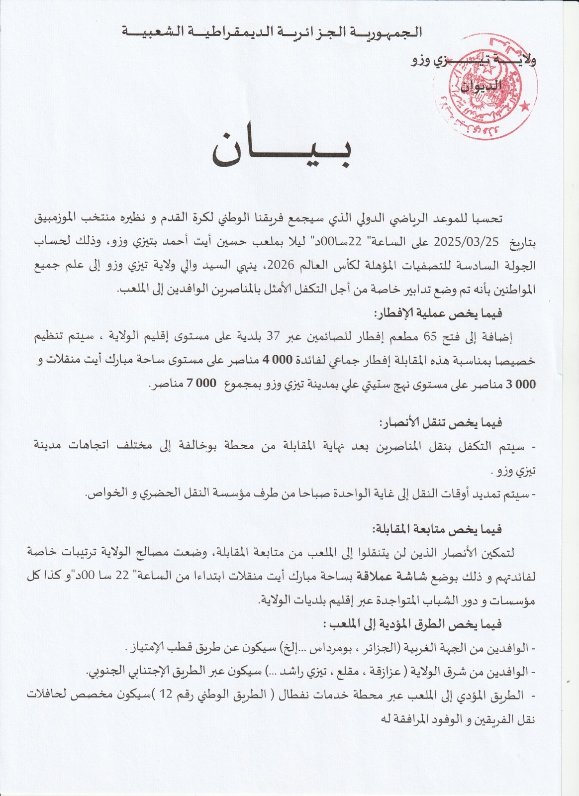 أعلن والي تيزي وزو، عن جملة من التدابير، من أجل التكفل الحسن بأنصار “الخضر” المتنقلين إلى ملعب “حسين آيت أحمد” تحسبا لمواجهة موزمبيق.