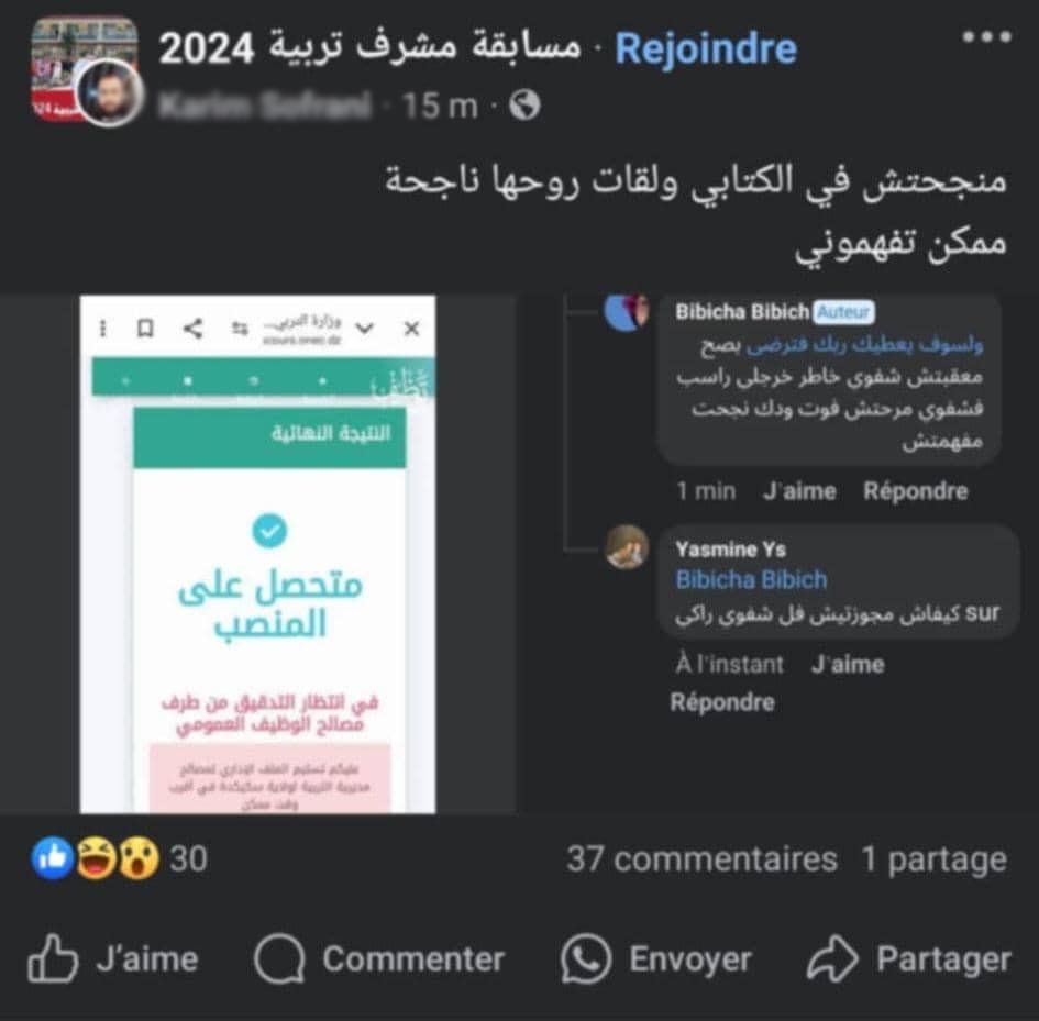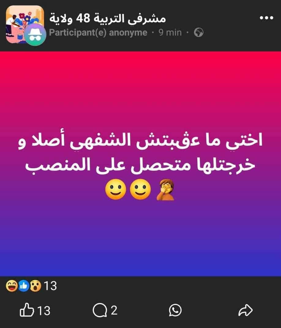 مباشرة بعد إعلان نتائج مسابقات التوظيف على أساس الاختبارات للإلتحاق بـ 6 رتب تابعة لسلك التربية الوطنية، انتشرت عبر مواقع التواصل الإجتماعي منشورات لعديد المترشحين الذين نجحوا في المسابقة دون مشاركتهم في الإختبارات أصلا.
