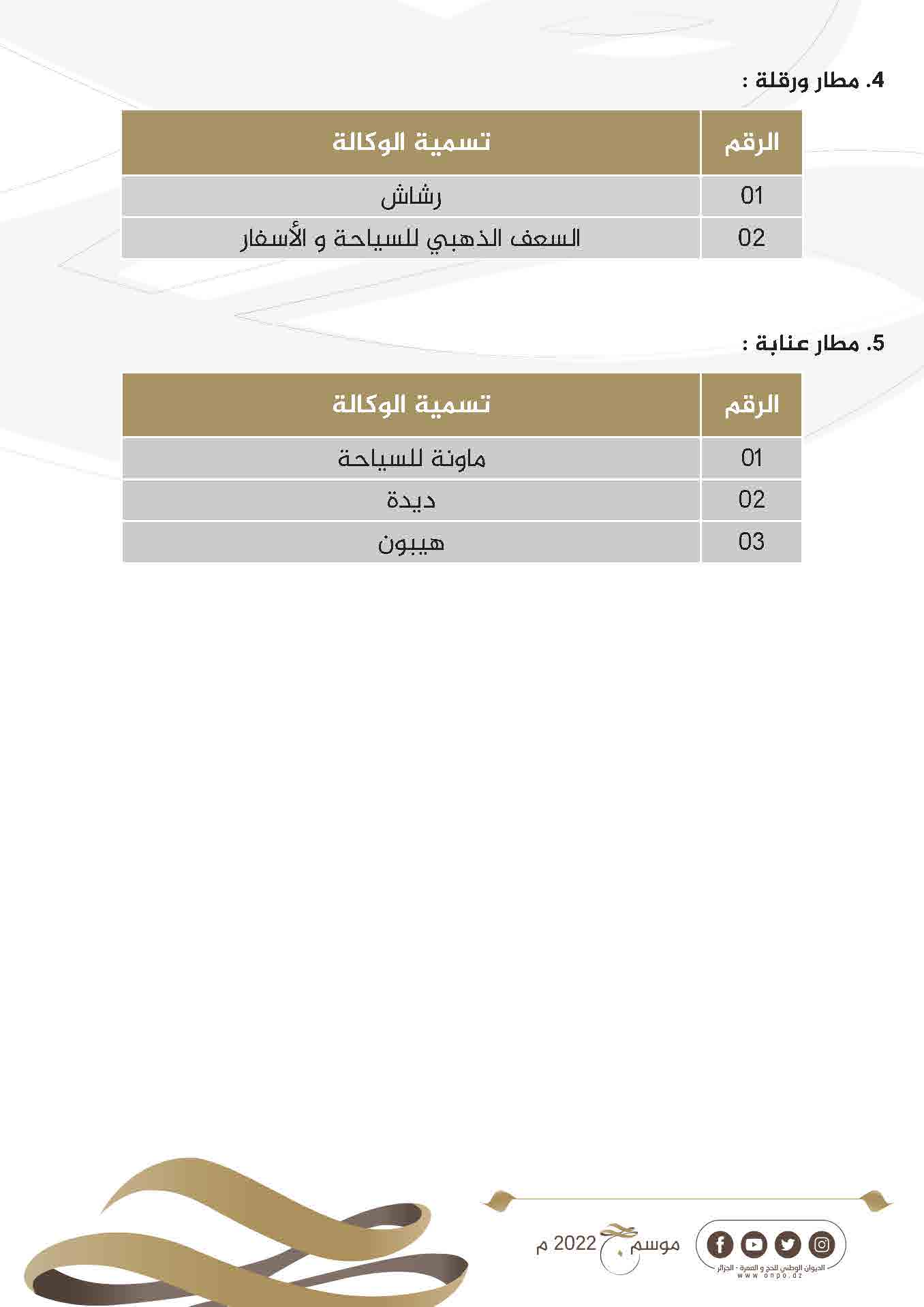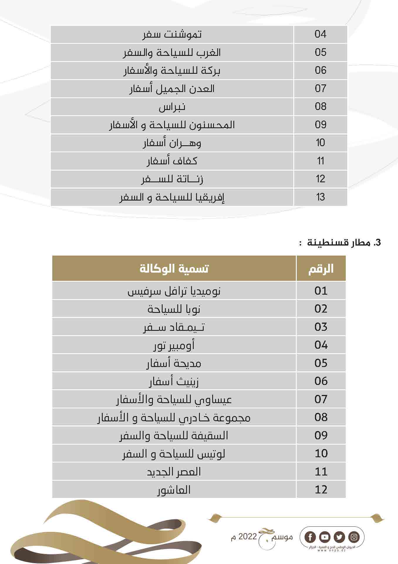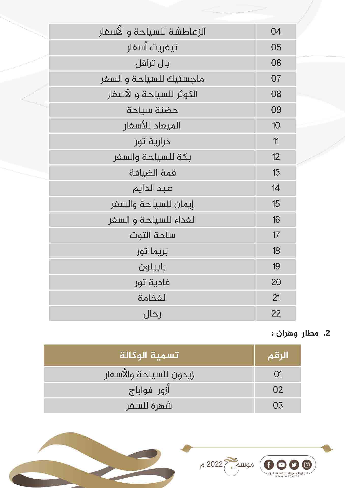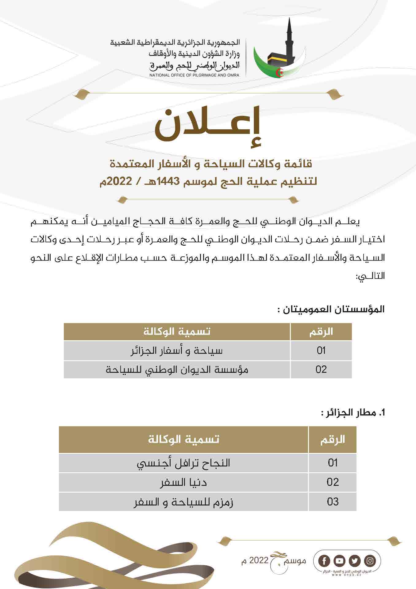 نشر الديوان الوطني للحج والعمرة عبر حسابه على الفيسبوك قائمة وكالات السياحة والأسفار المعتمدة لحج 1443ه- 2022م.