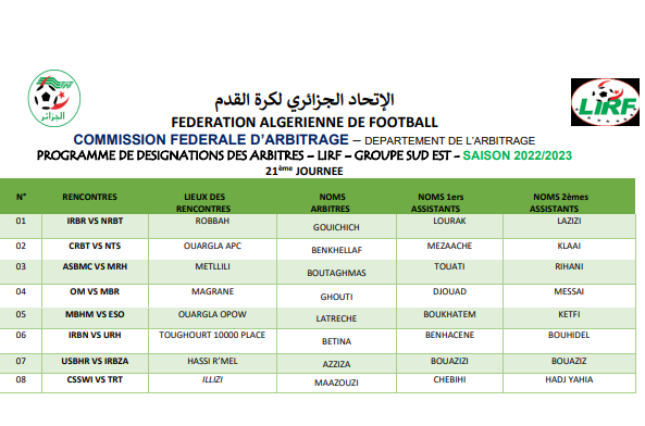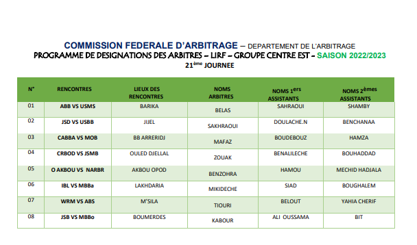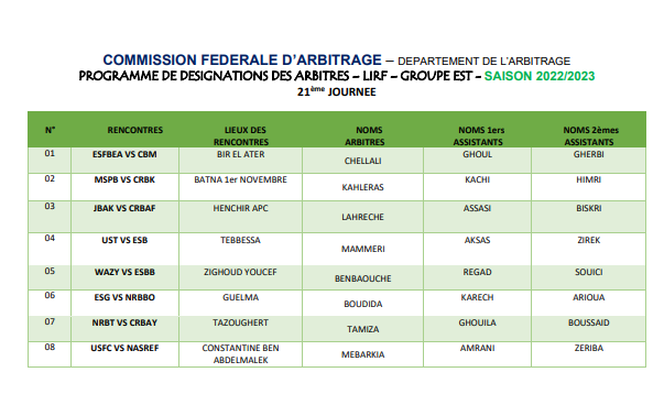أعلنت الاتحادية الجزائرية لكرة القدم ، اليوم الخميس، عن أسماء الحكام الذين سيديرون مباريات الجولة 21 من قسم الهواة.