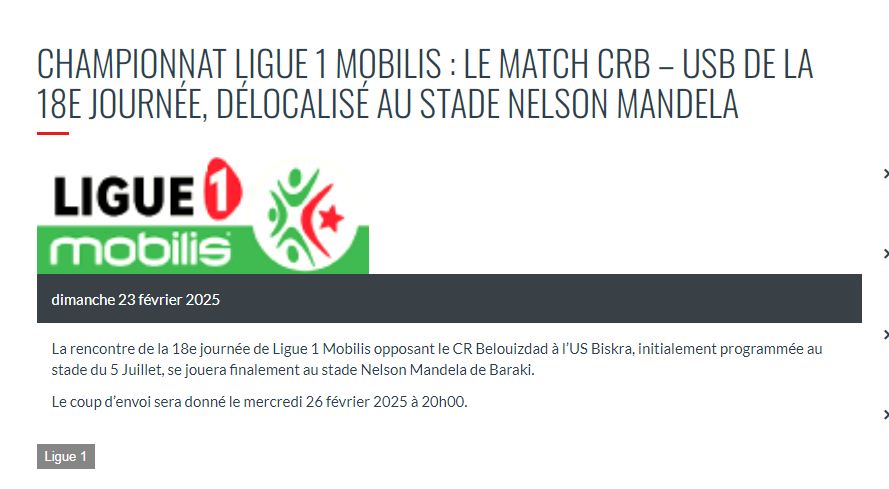 وأفادت الرابطة عبر موقعها الالكتروني، بأن لقاء بلوزداد وبسكرة، تم تحويله إلى ملعب “نيلسون مانديلا” ببراقي، على أن ينطلق بداية من الساعة 20:00.