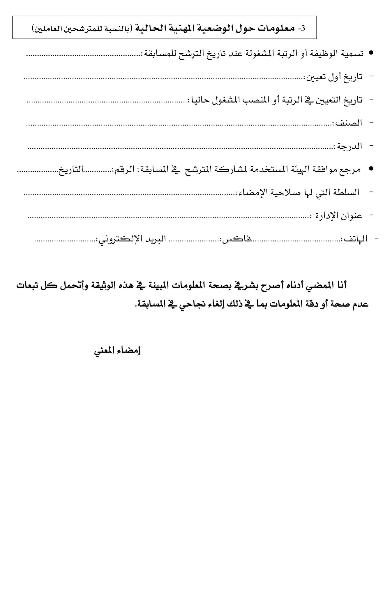 ويتعين على المترشحين المقبولين نهائيا قبل بداية التربص التكويني استكمال الملفات الإدارية بنسخة من الوثيقة التي تثبت الوضعية القانونية للمترشح إزاء إلتزامات الخدمة الوطنية أو الإعفاء لأسباب غير طبية. 3 شهادات طبية تتعلق بالطب العام “الأمراض الصدرية، العيون، طبيب أخصائي”. شهادتي ميلاد رقم 7، شهادة قياس القامة، شهادة عائلية خاصة بالمترشحين المتزوجين، صورتان شمسيتان.