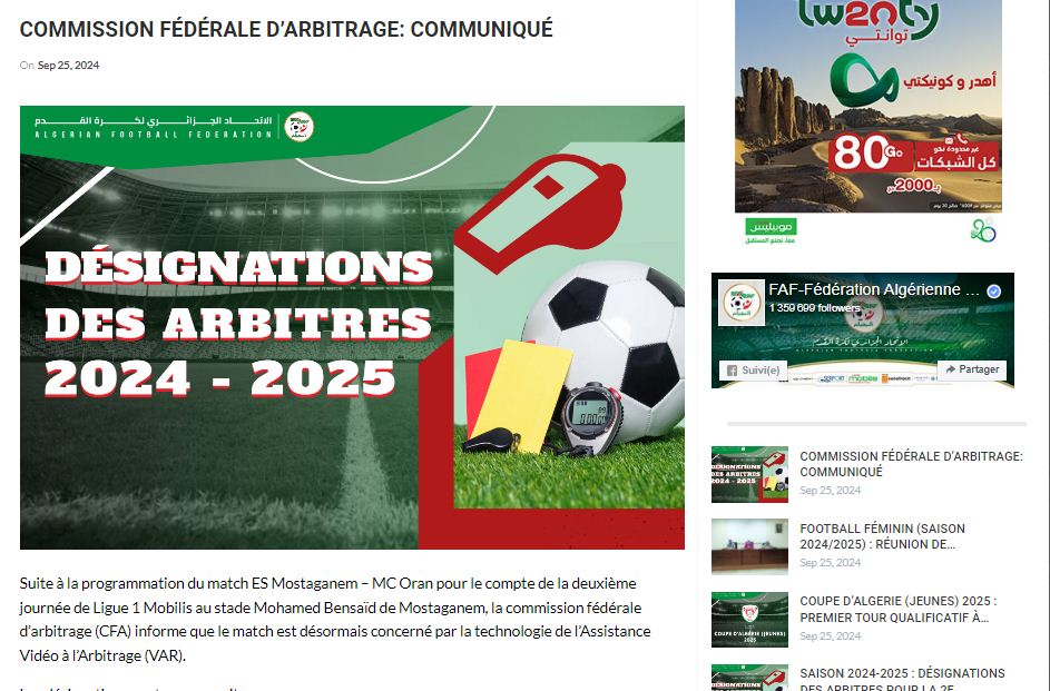 وقالت “الفاف” إن قرار الاعتماد على “الفار” جاء عقب تحويل اللقاء المندرج، ضمن الجولة الـ 2 من البطولة المحترفة، إلى ملعب “قائد فراجي” إلى الملعب الجديد “محمد بن سعيد” بمستغانم”.