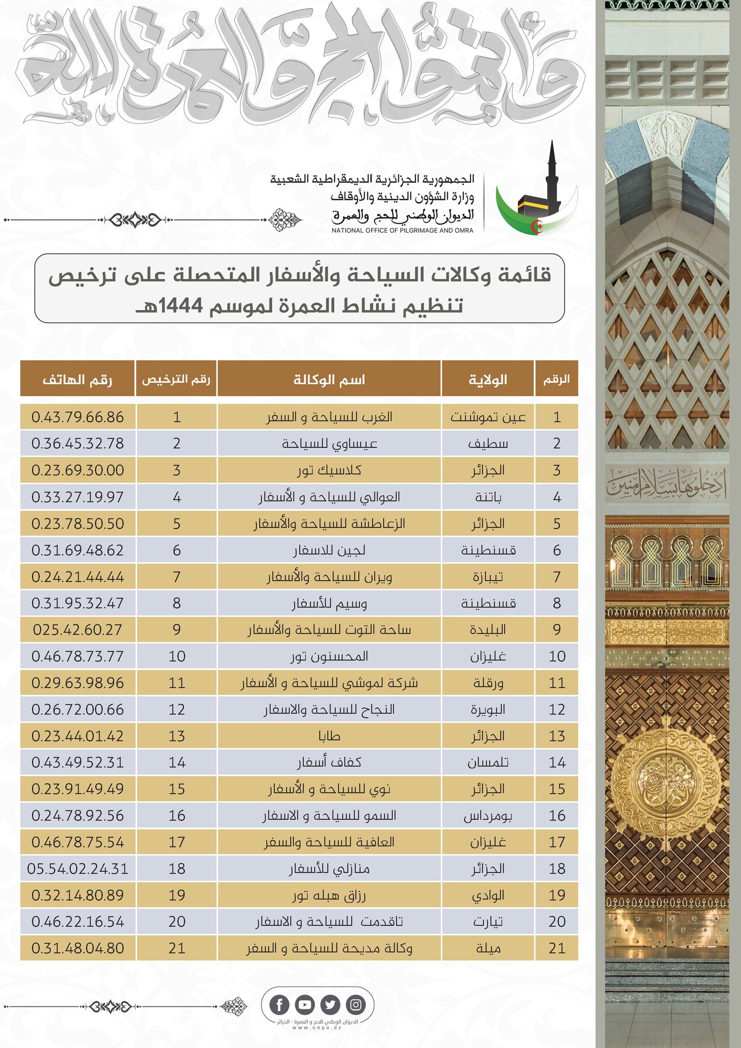 أعلن الديوان الوطني للحج والعمرة، اليوم الثلاثاء، عن أسماء الوكالات الـ21 المعنية بتنظيم العمرة لموسم 1444 ه. كما أوضح بيان الديوان، تسليم التراخيص جاء بعد تقديم الوكالات المعنية لملفات طلب الاعتماد والقيام بإجراءات الترشح عبر البوابة الجزائرية للعمرة. وهذا منذ تاريخ 1 سبتمبر الجاري بناءً على دفتر الشروط الخاص بهذه العملية.