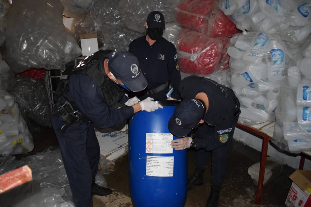 بالإضافة إلى 575 كلغ من مادة بيكربونات الصوديوم، و875 كلغ من مواد كيميائية في شكل مسحوق، و910 كلغ من مواد كيميائية في شكل سائل مجهولة المصدر.
