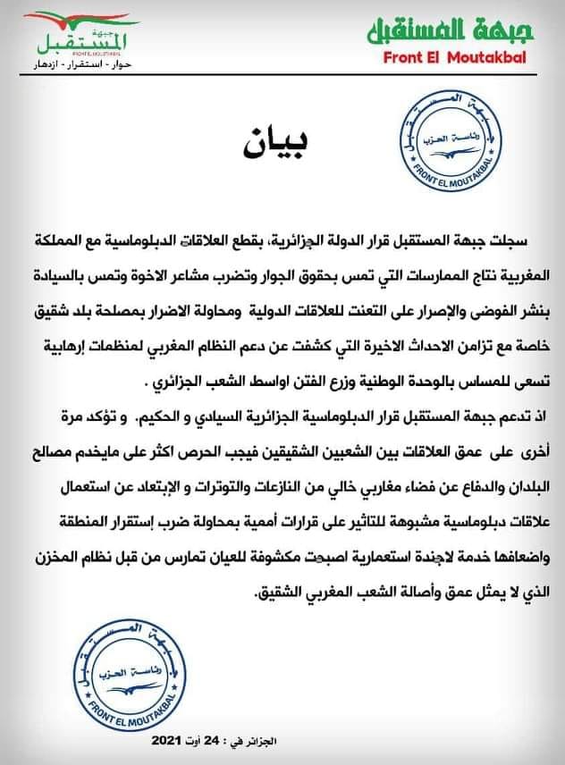 دعمت جبهة المستقبل قرار الدبلوماسية الجزائرية السيادي و الحكيم، بقطع العلاقات الدبلوماسية مع المملكة المغربية نتاج الممارسات التي تمس بحقوق الجوار وتضرب مشاعر الاخوة.
