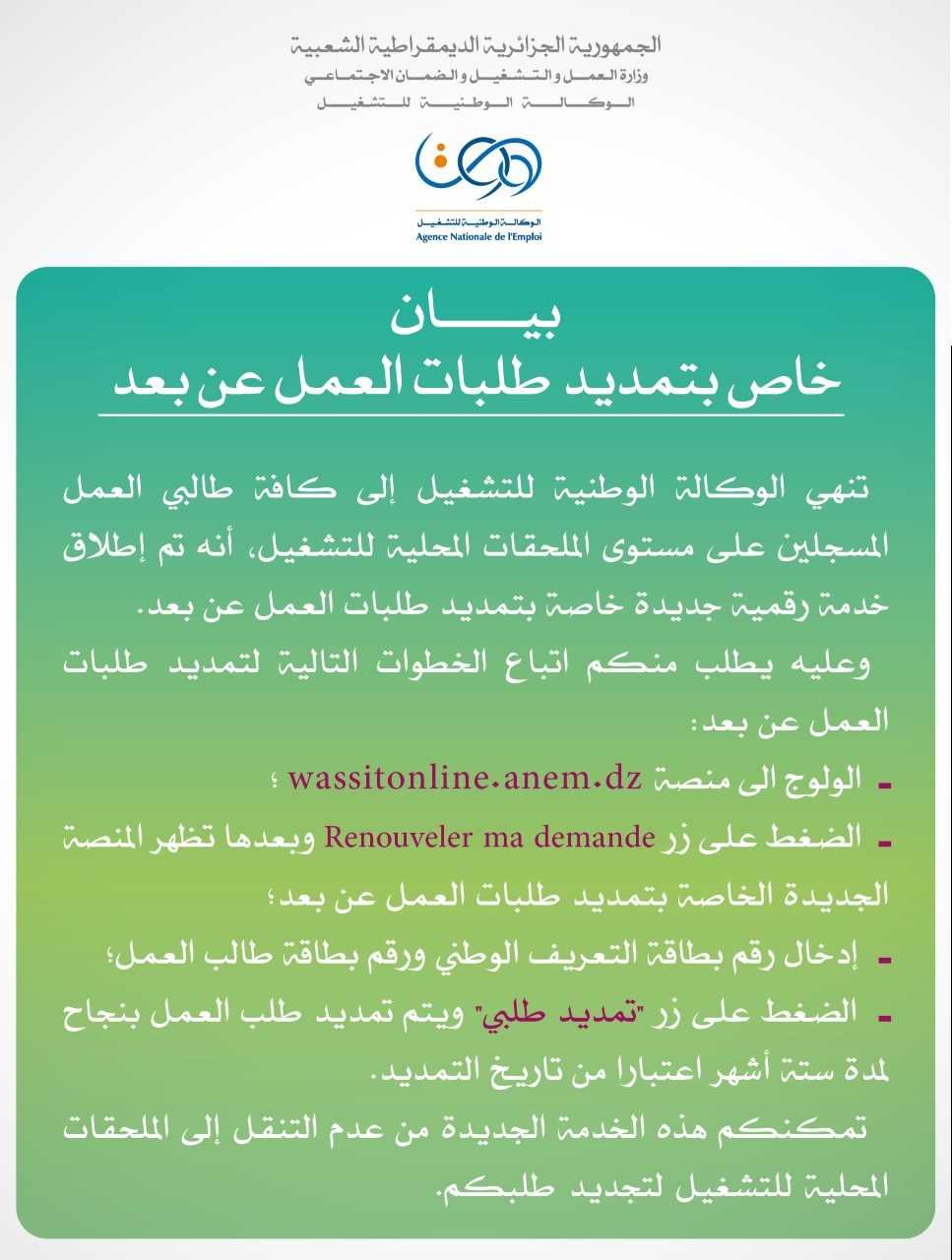 ولتجديد العملية بجب أولا الولوج إلى المنصة wassitonline.anem.dz . ثم الضغط على زرrenouveler ma demande وبعدها تظهر المنصة الجديدة الخاصة بتمديد طلبات العمل عن بعد.