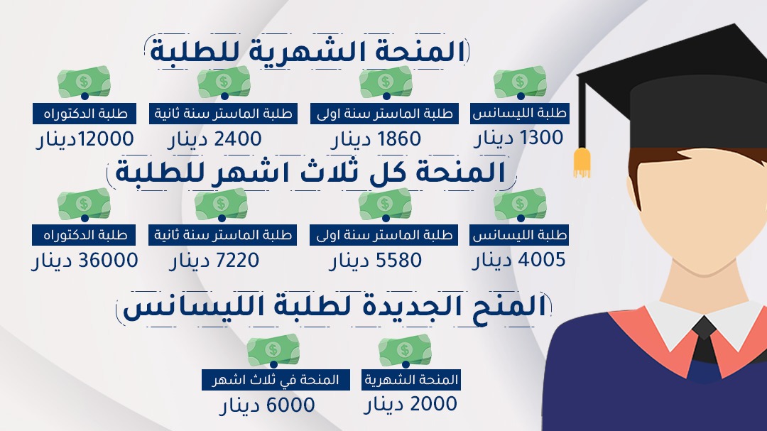 كما أشار إلى أن طلبة السنة أولى “ماستر” يستفيدون شهريا من مبلغ 1860 دينار. ما يعادله 5580 دينار في ثلاثة أشهر. أما طلبة السنة الثانية ماستر يستفيدون من 2400 دينار في الشهر ما يعادله 7220 دينار في الثلاث أشهر.