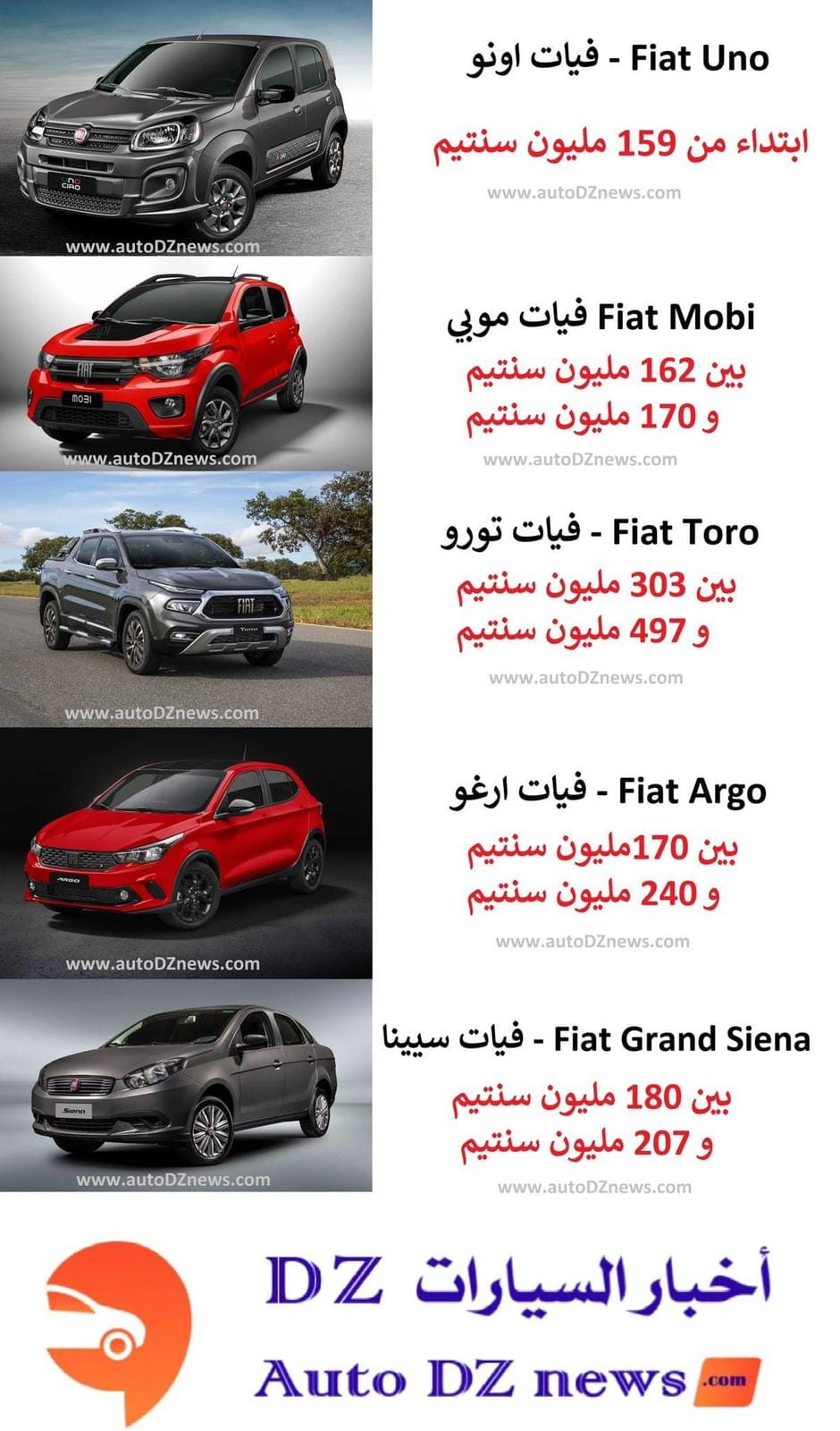كما نشر زبدي نقلا عن صفحة أخبار السيارات dz-. auto dz news أسعار سيارات فيات المتوقعة وذلك حسب نوع السيارات وقوتها والتي جاءت كمايلي: