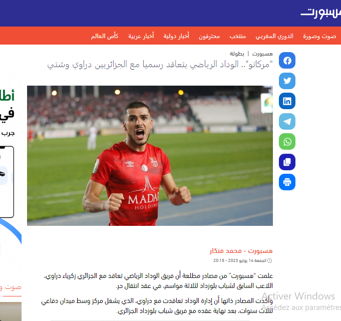 وكشف موقع “هسبورت” المغربية من مصادره الخاصة، أن زكرياء دراوي تنقل إلى الوداد البيضاوي في صفقة انتقال حر، وهو الذي تواجد في المغرب منذ أيام.