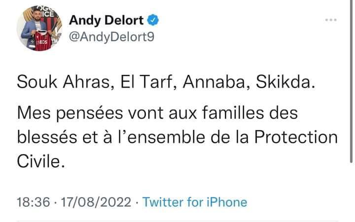 ابدى الدولي الجزائري اندي ديلور تضامنه مع عائلات المصابين في الحرائق التي اندلعت في الجزائر وبالخصوص في الشرق الجزائري.