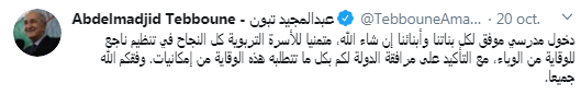 ونشر الرئيس تبون تغريدة عبر صفحته على التويتر “دخول مدرسي موفق لكل بناتنا وأبنائنا إن شاء الله”.