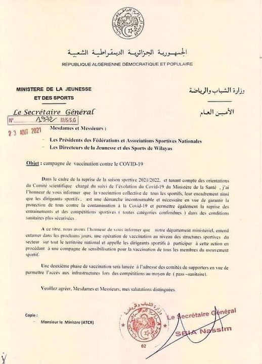 وكشف بيان وزارة الشباب والرياضة أن دخول الأنصار إلى الملاعب الموسم المقبل يكون ببطاقة التلقيح التي ستكون إلزامية على الأنصار، الصحافة، اللاعبين، وحتى المسيرين.