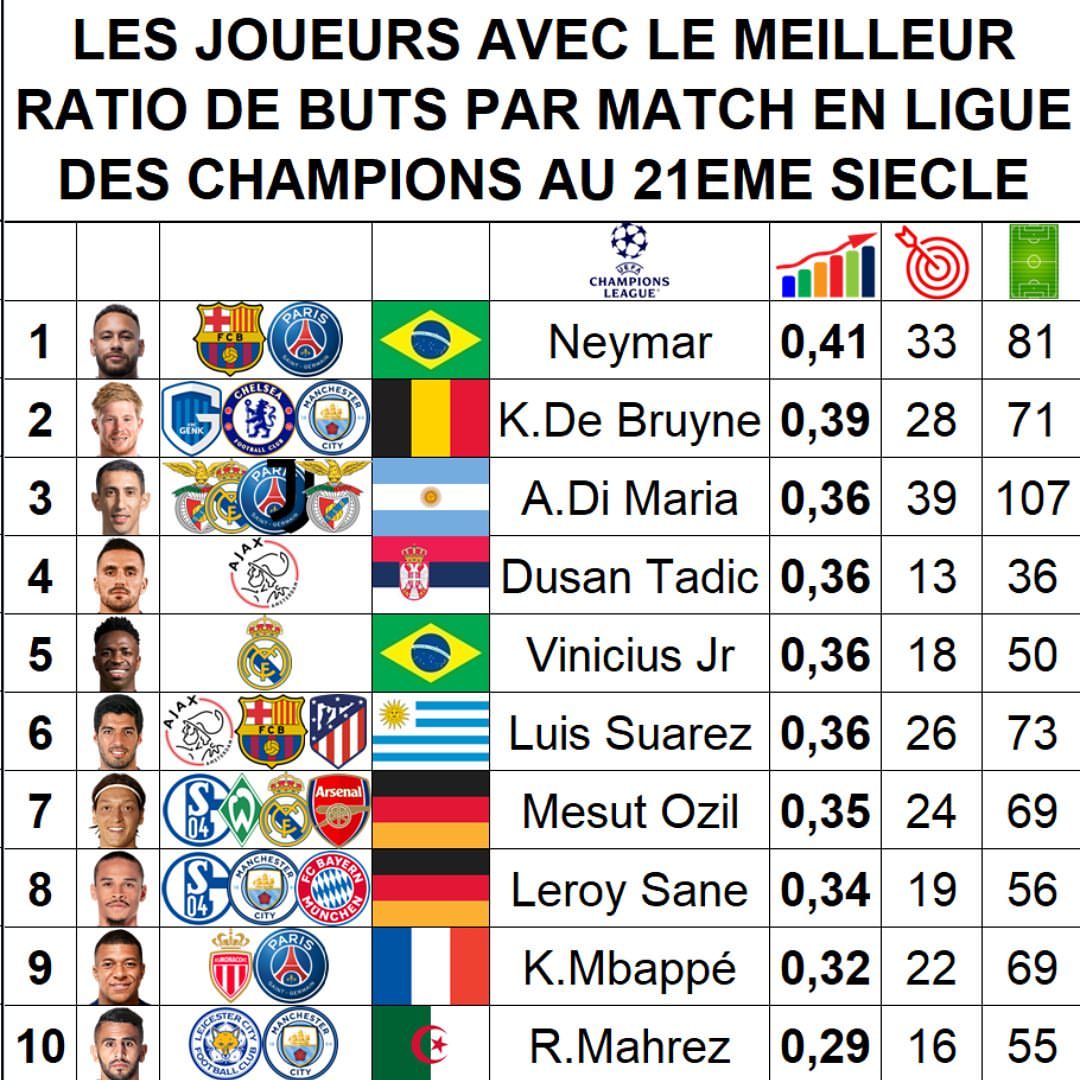 كما يعد محرز اللاعب الوحيد عربيا و إفريقيا المتواجد في هذه القائمة، لأكثر عشرة لاعبين تحقيقا لأعلى نسب تمريرات حاسمة في المباراة الواحدة لمنافسة رابطة الأبطال، خلال القرن الواحد والعشرين.
