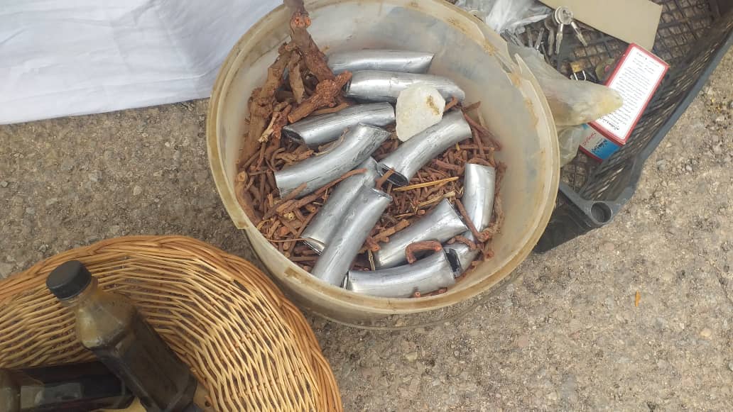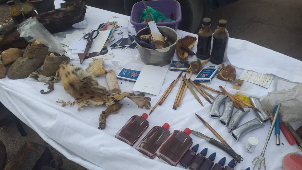 حيث تم حجز طلاسم وحروز وصور فوتوغرافية لعدة أشخاص وجلود حيوانات ومستحضرات. ومعدات تستعمل في السحر والشعودة ومبلغ مالي وحلي من المعدن الأصفر.