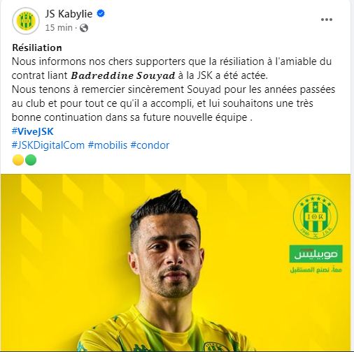 كما وجهت الإدارة القبائلية شكرا خاصا لسوياد، بعد كل ما قدمه للنادي في السنوات الماضية، متمنية له حظا موفقا في ناديه الجديد.