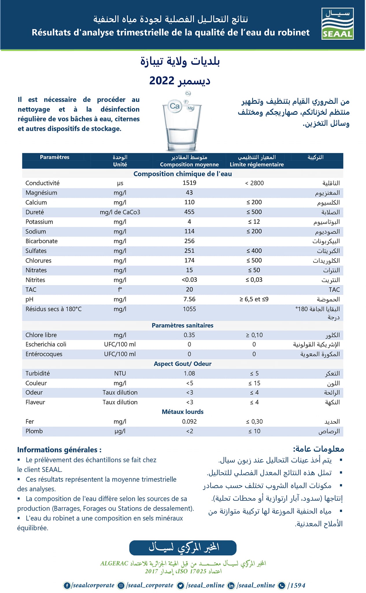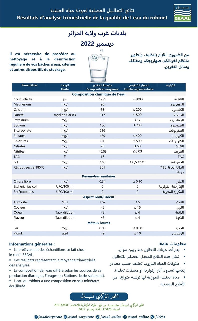 وقدمت سيال، معدل نتائج التحاليل الفصلية لجودة مياه الحنفية بولايتي الجزائر و تيبازة كما هو موضح بالوثائق المرفوقة بالمقال.