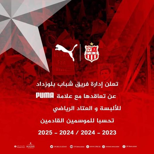 أعلنت إدارة شباب بلوزداد، عبر الصفحة الرسمية على الفايسبوك، اليوم الأربعاء، عن التعاقد مع العلامة التجارية بوما للألبسة و العتاد الرياضي.