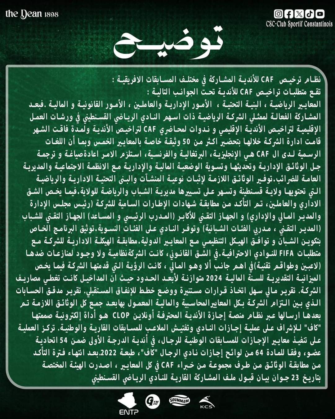 كما أوضح مسؤولي النادي القسنطيني، بأن تحصلهم على هذه الاجاوة، جاء بعد استيفائهم جميع المعايير المطلوبة، والخاصة المعايير الرياضية، البنية التحتية، الأمور الإدارية والعاملين، الأمور القانونية والمالية.