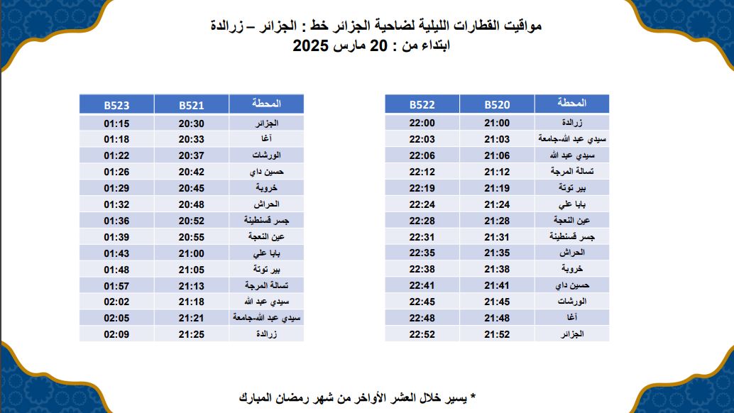 أطلقت الشركة الوطنية للنقل بالسكك الحديدية، برنامج رحلات ليلية لخطوط ضاحية الجزائر، خلال العشر الأواخر من شهر رمضان المبارك.