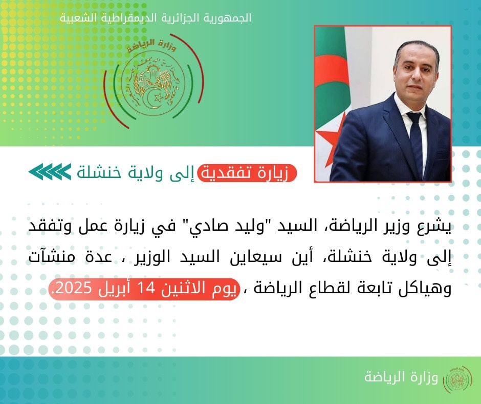 وكشفت وزارة الرياضة عبر الصفحة الرسمية لها على “الفايسبوك” اليوم لاأحد، أن وليد صادي سيتفقد كل صغيرة و كبيرة على المنشأت الرياضية التي تزخر بها مدينة خشنلة سواء التي شيدت سابقا، أو التي على قيد البناء.